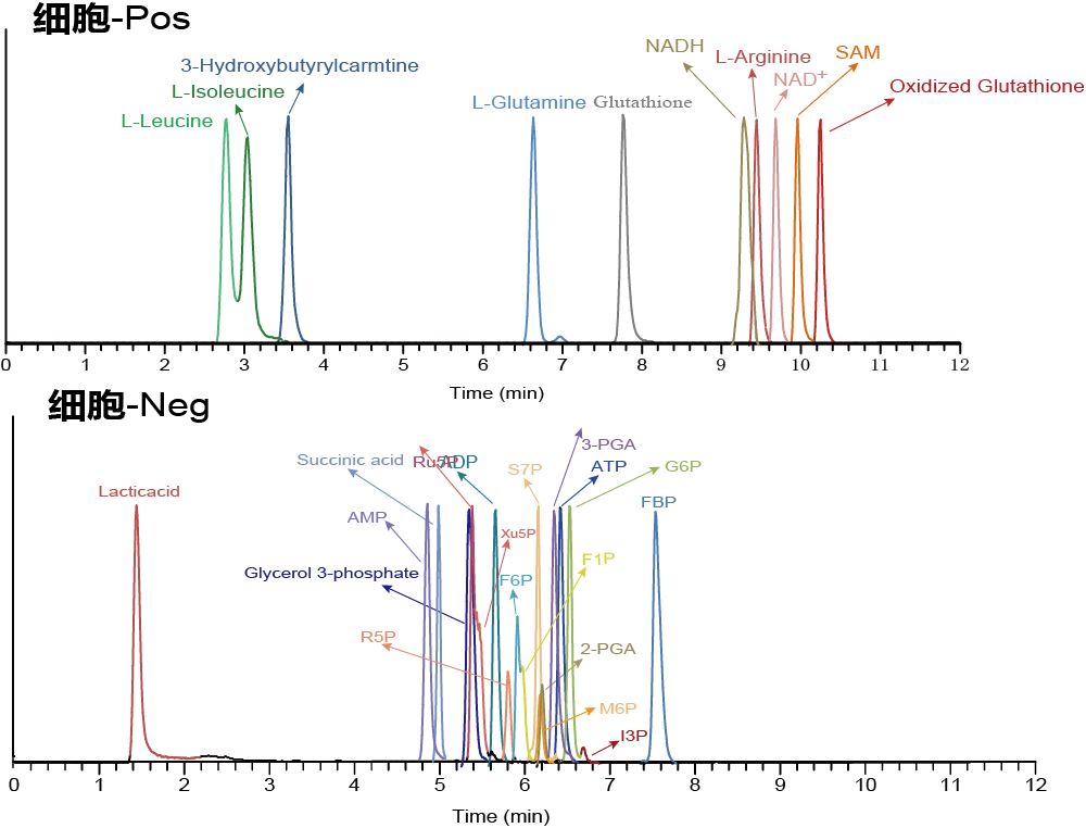 HILIC非靶向代谢组学技术与RPLC代谢组学技术是两种互补的代谢组学技术,其作用甚至比常规RPLC代谢组学技术更加重要。HILIC非靶向代谢组学技术弥补了常规RPLC非靶向代谢组学技术的不足,显著促进了非靶向代谢组学技术的代谢物覆盖面,使得代谢组学的无偏向性更加具体和真实。制约HILIC非靶向代谢组学技术应用的主要原因在于HILIC色谱的作用机理复杂,稳定性不足,成本高。谱领生物始终专注于代谢组学技术研发,建立了成熟的HILIC色谱技术系统解决方案。不仅对常规的亲水性代谢物分离检测驾轻就熟,而且对具有高度挑战性的糖酵解、戊糖磷酸途径以及核苷酸等含磷酸代谢物的检测更加得心应手。